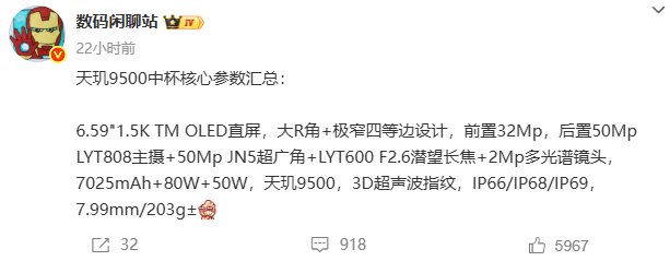 近日,据博主@数码闲聊站 透露:“天玑9500中杯核心参数汇总:6.59"1.5K TM OLED直屏,大R角+极窄四等边设计,前置32Mp,后置50Mp LYT808主摄+50Mp JN5超广角+LYT600 F2.6潜望长焦+2Mp多光谱镜头,7025mAh+80W+50W,天玑9500,3D超声波指纹,IP66/IP68/IP69,7.99mm/203g±”。毫无疑问,战哥爆料的机型配置便是OPPO Find X9。